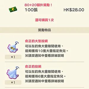 釣魚大會加油禮包(可購買1次):100張葉子票劵、1個俞正的大型投網、1個俞正的投網。
