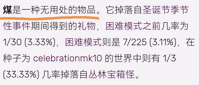 泰拉瑞亞遊戲中的煤礦是沒有任何屬性作用的,它可以通過開禮物獲取,並不推薦玩家收藏,因為它只會佔取玩家倉庫的儲存量。