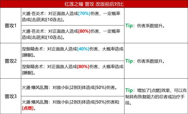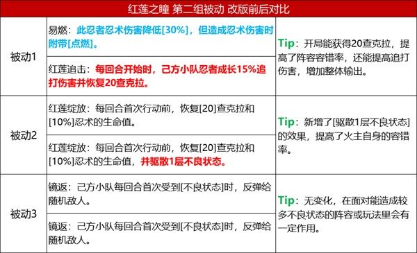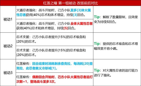 1、紅蓮之瞳的被動分別能夠強化火屬性忍者的忍體、增加火屬性忍者的追打次數、讓己方小隊忍者成長追打傷害;