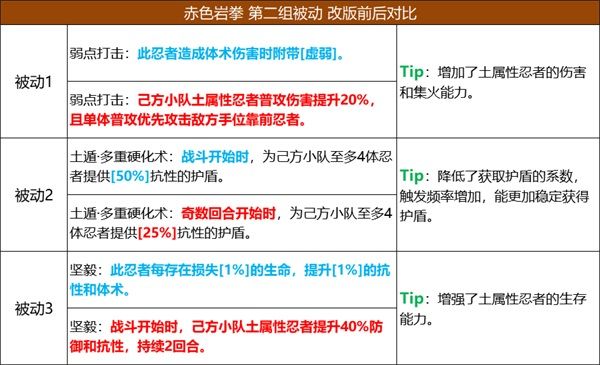 1、被動「火遁忍者強化」和「紅蓮秘傳」對小隊的火屬性忍者加強較大;