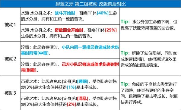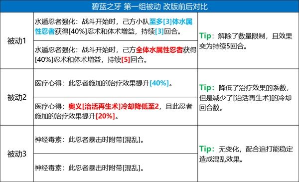 1、被動「水遁忍者強化」對小隊的水屬性忍者加強較大;