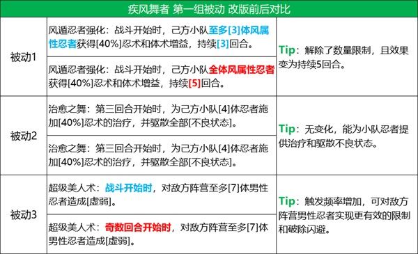 1、被動「風遁忍者強化」對小隊的風屬性忍者加強較大;