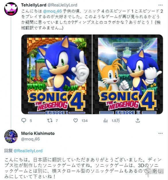 該問題是一位非常喜愛《索尼克4》(2010)的玩家(推特用戶 RealJellyLord)提起的,當《索尼克:未知邊境》這款3D遊戲獲得成功後,他想知道未來是否還會有類似《索尼克4》這樣的2D橫版的《索尼克》遊戲,甚至再次與Dimps(《索尼克 極速冒險》開發商)合作。儘管未提及是否合作的問題,但 岸本守央 肯定未來會有2D橫版的《索尼克》遊戲。