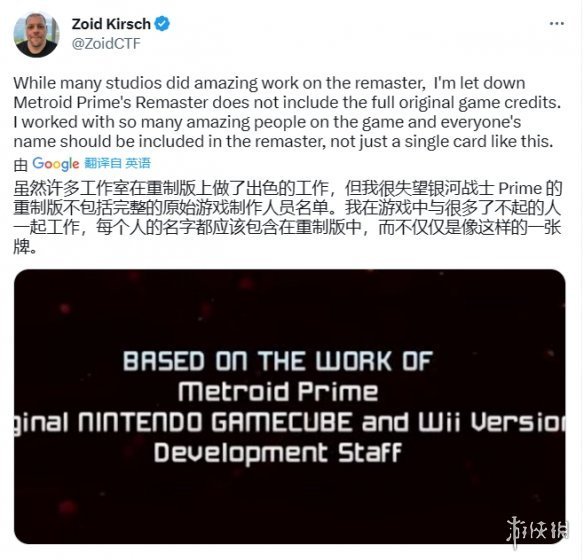 前 Retro Studios 工程師 Zoid Kirsch,也是《銀河戰士Prime》原版的開發人員,在推特上表示,《銀河戰士Prime 復刻版》的致謝名單中未包含完整原始遊戲製作人員名單,僅僅用一段話就敷衍了事,他對這種做法感到不滿。