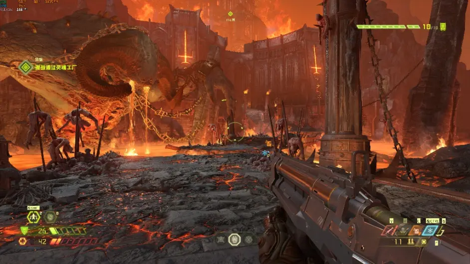 在移動的過程中,快速瞄準並命中敵人,這個玩法十分具有動作感。而為了提升機動性,遊戲也為超級霰彈槍增加了肉鉤功能,可以實現遠距離快速靠近並貼臉擊殺。每個敵人也都有一個不同的安全距離,只要在這個距離之外,敵人是不會命中玩家的,所以不管怎樣,跑起來是第一要義。