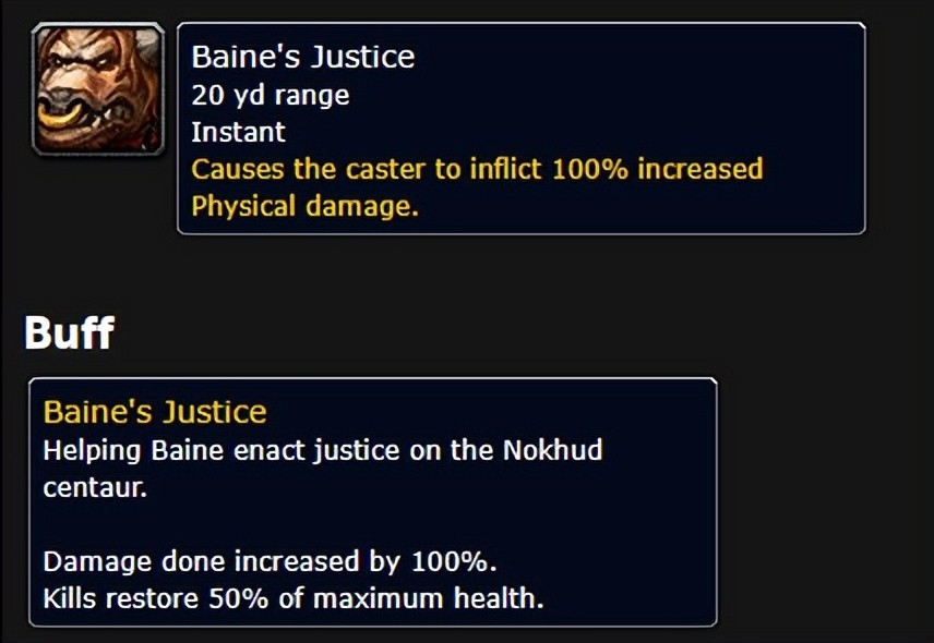 貝恩·血蹄是凱恩·血蹄的兒子,牛頭部落的繼任領袖,主要功績是抵禦了當地半人馬的侵擾。在PTR中,玩家發現了一個名為「Baine's Justice」(貝恩的公正)的增益Buff,涉及一場與馬魯克半人馬的戰斗,另有一個名為「Baine's Potion of Invisibility」(貝恩的隱形葯水)的道具,用於某個潛入任務。另外,一些牛頭人主題的頭飾、項鏈、武器、任務物品,以及新的牛頭NPC也被發現。