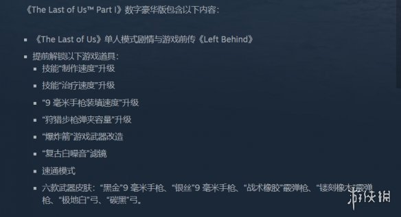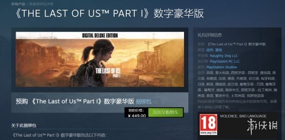 《最後生還者重製版》的數字豪華版已經可以在Steam平台上預購了,國區預購價格為449元。Steam頁面還公布了《最後生還者重製版》PC數字豪華版的內容。