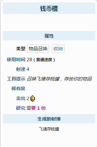 飛豬存錢罐又叫做錢幣槽,飛豬存錢罐可在血月中以1/200 (0.5%) / 1/100 (1%) 的概率在血月中從血腥僵屍和滴滴怪的掉落物中獲得,或者以更低的概率(1/4000 (0.03%) / 1/2000 (0.05%))從由雕像生成的血腥僵屍和滴滴怪的掉落物中獲得(不論是否處於血月中)。錢幣槽也能以1/15 (6.67%)的概率從在血月中通過釣魚出現的僵屍人魚和遊盪眼球怪魚的掉落物中獲得。