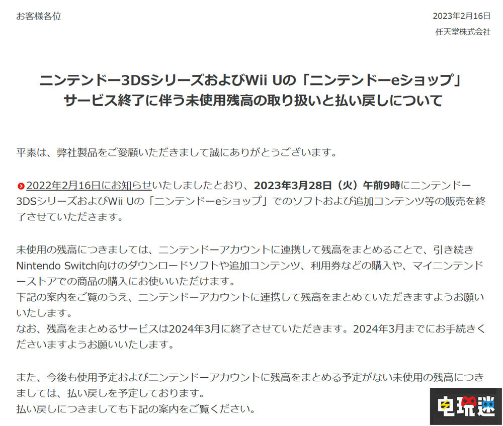 作為任天堂在上個世代的「一勝一敗」,已經關閉充值的3DS與WiiU的eShop在今年3月將關閉。同時任天堂在今天發布提醒公告,如果玩家在Nintendo Network ID(NNID)還有餘額,那就別忘了在2024年3月前轉移到新的Nintendo Account賬號上。