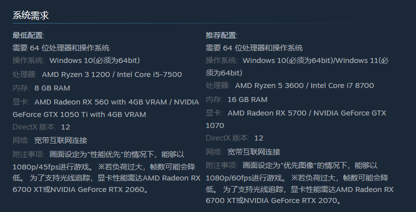 另外,《生化危機4重製版》公布最新的PC硬體需求,其中顯卡的最低需求是AMD Radeon RX 560或Nvidia GeForce GTX 1050 Ti,即可達到1080p的穩定60幀,和2021年的生化8差不多。雖然普通玩家用30或45幀玩也問題不大,但如果要開光追,顯卡需要達到AMD Radeon RX 6700 XT 或 NVIDIA GeForce RTX 2060的級別。