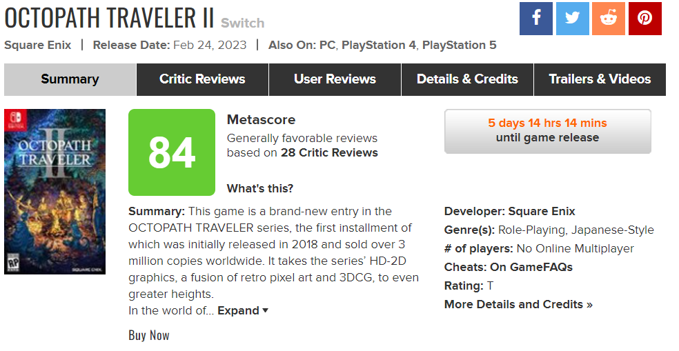 《歧路旅人2》還有6天就要發售了,M站解禁了遊戲的媒體評分,目前28家媒體平均分數為84分,屬於佳作品質。