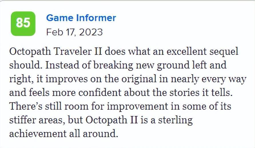 其中Game Informer給出了比較中肯的評價,認為《歧路旅人2》做到了一個優秀續集該作的事情。擴大了場景,豐富了人物故事,但並沒有革命性的進步。