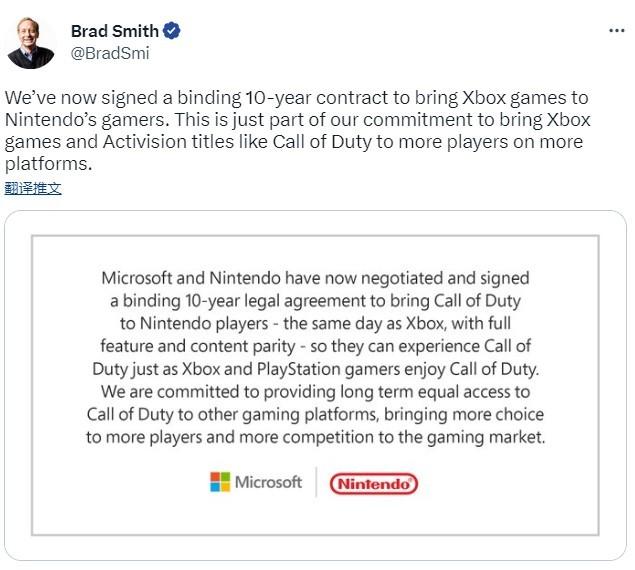 微軟副主席Brad Smith今天(2月21日)在推特上發文宣布,微軟已與任天堂簽署了一份有效期長達10年的協議,這將把Xbox遊戲和《使命召喚》帶給任天堂遊戲玩家,而《使命召喚》將與Xbox版同步,並且內容相同,今後任天堂玩家也可以享受與Xbox和PlayStation玩家一樣的《使命召喚》遊戲內容。此外,Brad Smith還表示這隻是微軟致力於將Xbox遊戲和動視遊戲(例如《使命召喚》)帶到更多平台上的承諾的一部分。