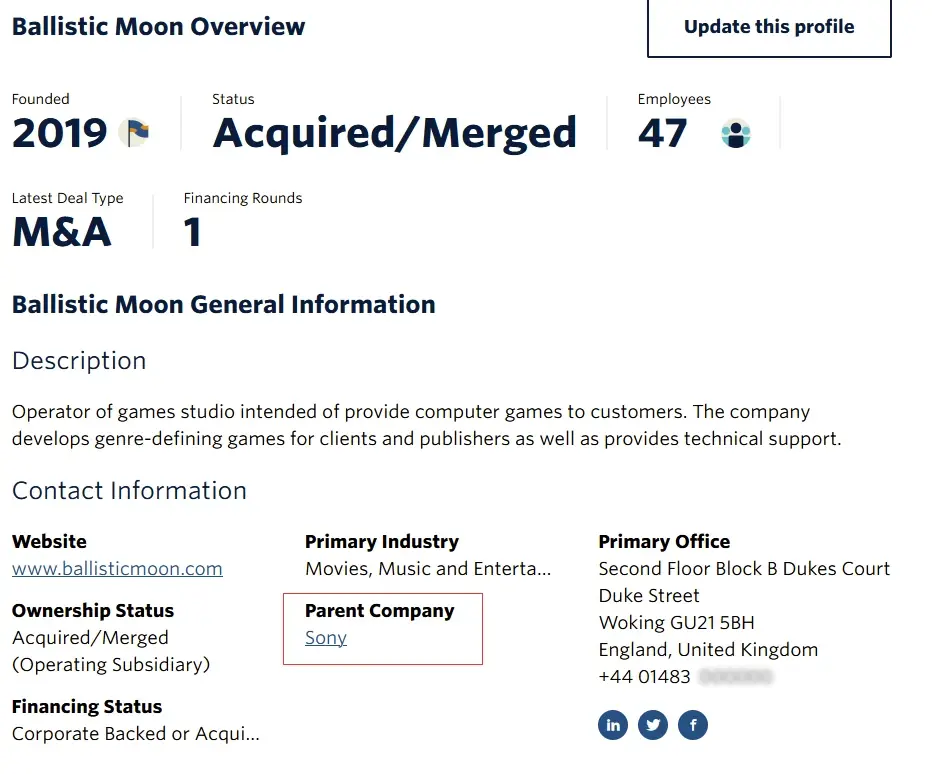 據海外媒體PlayStation LifeStyle報導,索尼已完成對於Ballistic Moon工作室的收購。收購的消息來源出自一家海外的金融查詢網站PitchBook,在Ballistic Moon 的頁面中,公司的運營狀態為「已被收購/合並」,其母公司正是索尼。