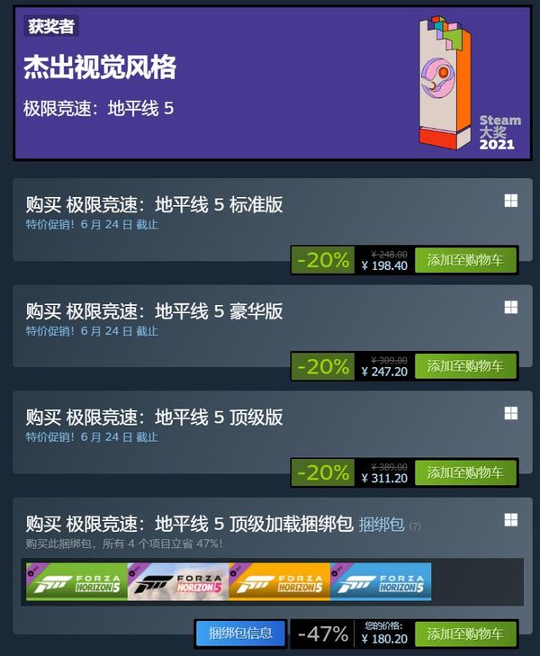 目前在steam上《極限競速:地平線5》標准版、豪華版、頂級版遊戲均已開啟八折促銷,活動截止至6月24日。