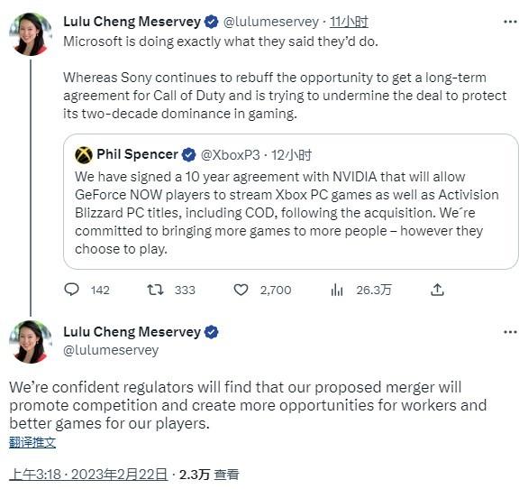 動視暴雪高管Lulu Cheng Meservey在另一篇推文中寫道:「微軟正在完全按照他們所說的去做……而索尼仍在拒絕獲得《使命召喚》長期協議的機會,並試圖破壞該交易以保護其在遊戲領域長達兩個十年的主導地位。」