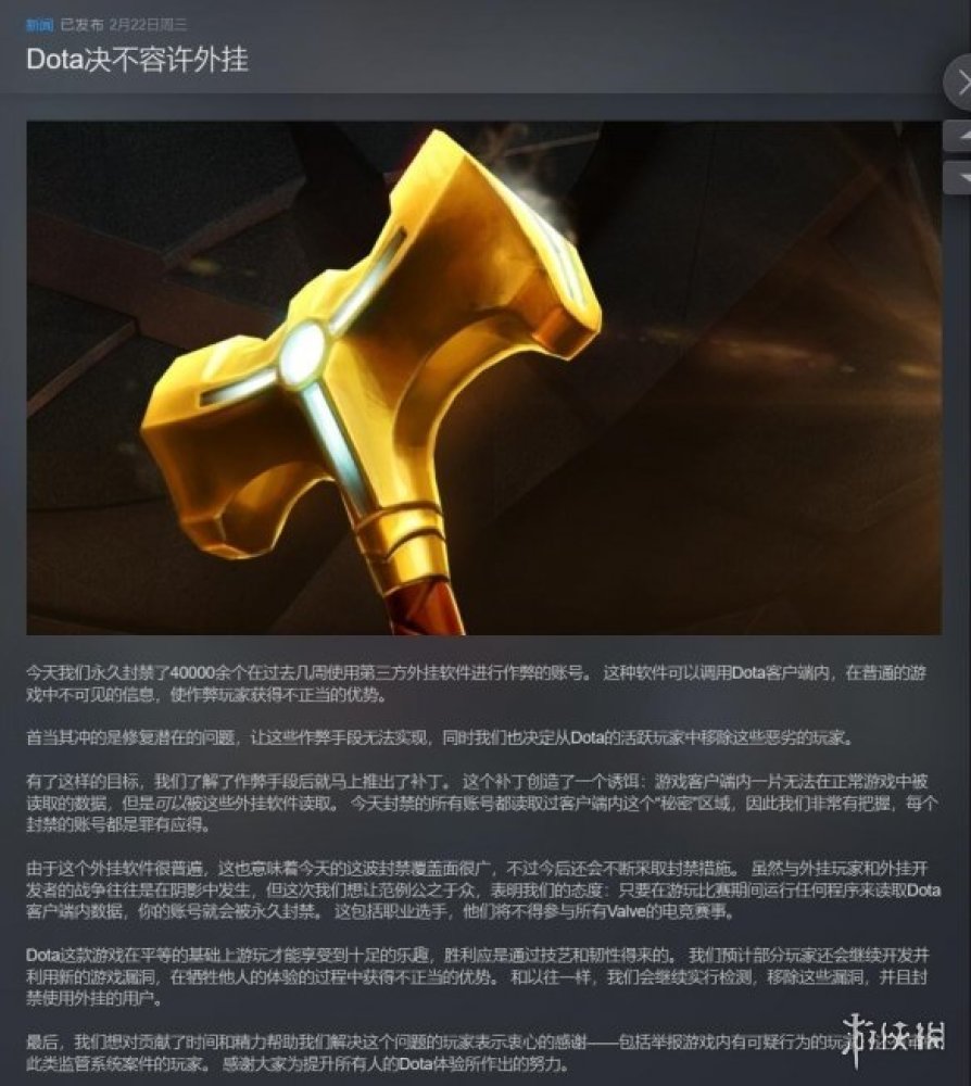 V社今日發布「Dota決不容許外掛」更新日誌,宣布封禁4萬多個在遊戲中使用作弊手段的用戶賬號。