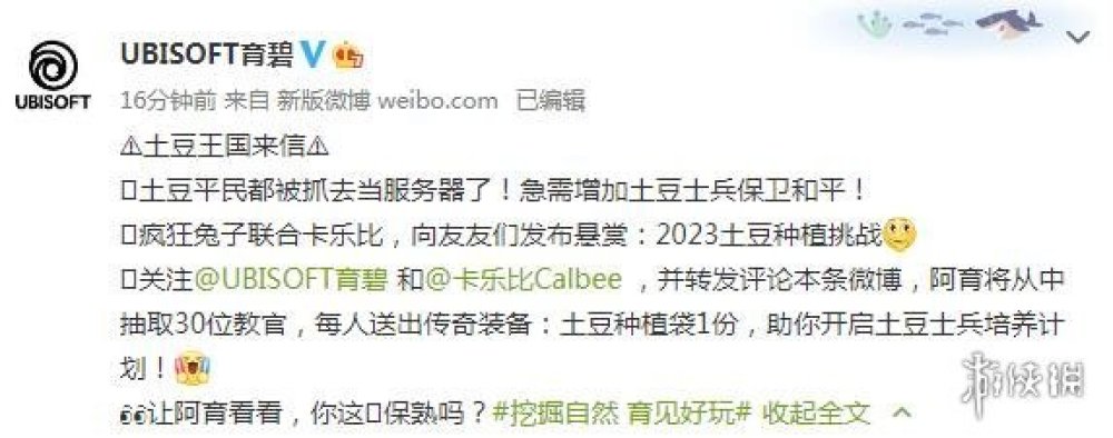 育碧中國宣布與日本休閑食品品牌Calbee卡樂比合作,開展土豆種植挑戰賽活動。官博中育碧表示「土豆平民都被抓去當伺服器了!」。