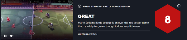 IGN為本作打出了8分:《馬力歐激戰前鋒:戰鬥聯賽》是一款非常有趣的頂級足球遊戲,儘管它並沒有什麼新意。