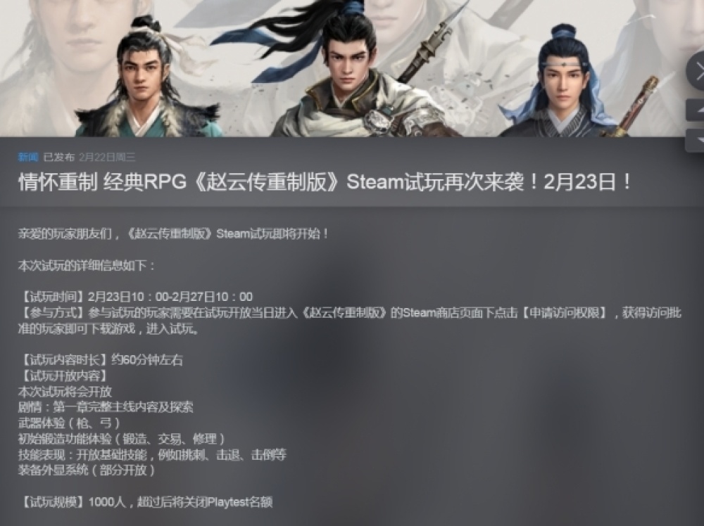 《趙雲傳重製版》官方宣布試玩再次開啟,本次試玩時間從2月23日10:00~2月27日10:00,名額有限。玩家可以在試玩開放後進入《趙雲傳重製版》Steam頁面,點擊「申請訪問許可權」,即可獲得試玩資格。
