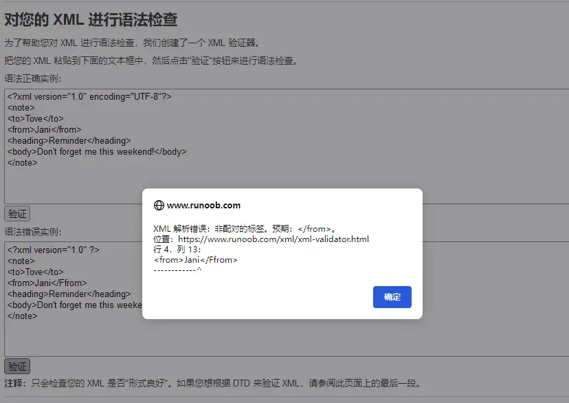 2、XML驗證器:在XML的應用場景中,基本上可以說是不具備自我糾錯能力的,因此需要保障文件的基本語法是正確的。而XML驗證器,發揮檢查最基本的語法內容的作用,能夠保證代碼的語法正確性,從而不至進入游戲後直接「紅一片」(一個XML驗證的網站,https://www.runoob.com/xml/xml-validator.html)。
