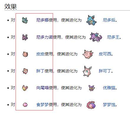 尼多娜、尼多力諾、皮皮、胖丁、向尾喵和食夢夢都可以使用月之石進化,提升屬性與能力值。月之石是在對站外使用的一次性道具。