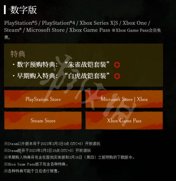 卧龍蒼天隕落正式版的Steam版將於2023年3月3日16點開放遊玩。Steam以外版本將於2023年3月3日0點開放遊玩。
