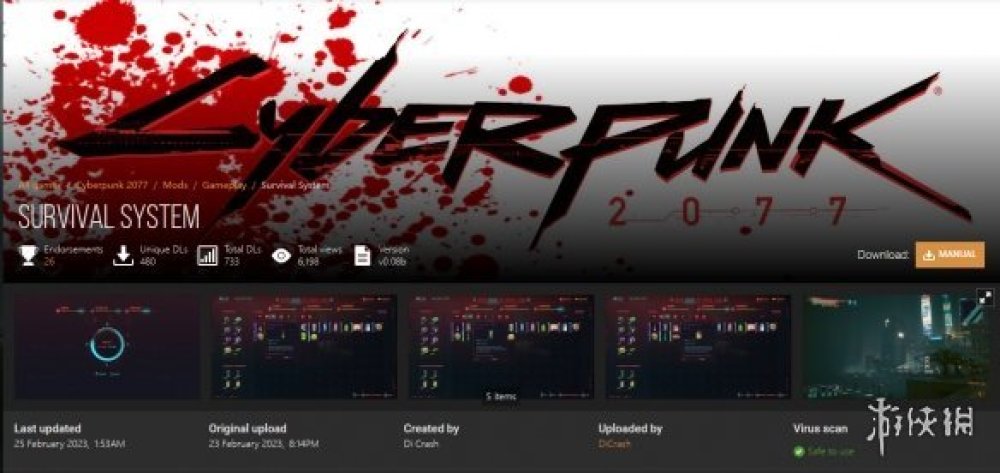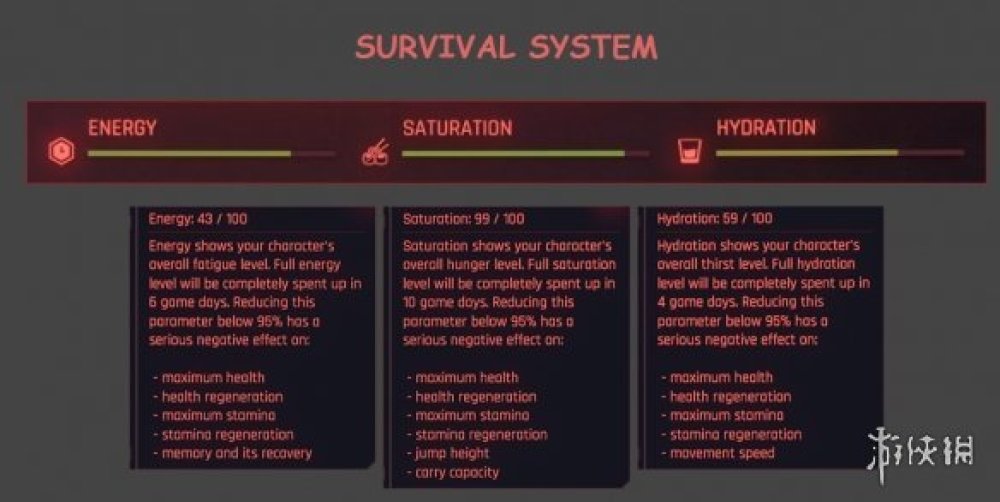 一直以來《賽博朋克2077》因為遊戲中食物的存在感較低(沒啥用)而被玩家抱怨,於是MOD製作者 DiCrash 推出了「2077生存模式MOD」,添加了 飢餓值、口渴值和疲勞值 設定,影響人物狀態,需要通過吃/喝東西以及休息來恢復,也相當於額外增加了難度。