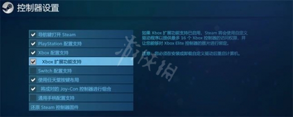 2.打開 Steam 平台,點擊左上角Steam欄下的設置菜單,進入後找到控制器頁面點擊常規控制器設置,勾選 Xbox 配置支持即可。