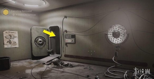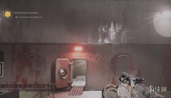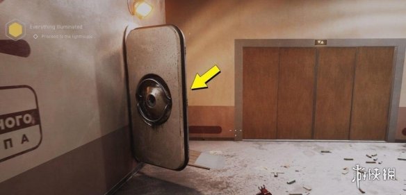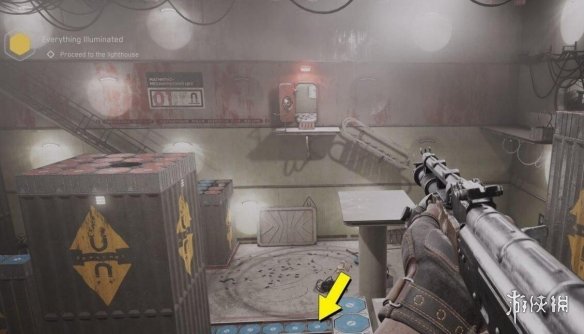找到銅貨拖斯基之後,離開房間右拐,進入剛才那個通風口旁邊的門,這裡是個大房間,清理掉敵人後從另一側角落的大門出去。拐角走樓梯上去,穿過前邊房間,對牆邊的電極使用電震波,前邊的水平金屬門會向左移動,現在可以過去了。