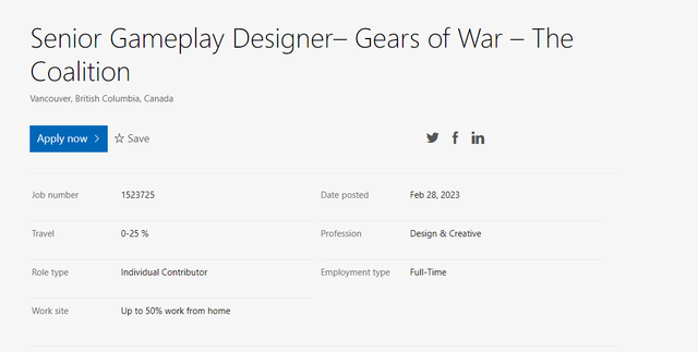 在微軟工作頁面上的職位發布中,《戰爭機器》系列的開發商The Coalition目前正在尋找一名《戰爭機器》的高級遊戲設計師。招聘信息表明,申請人應具有「角色、相機和控制」(3Cs)和人工智慧系統方面的經驗。