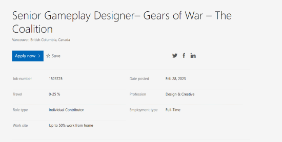 該招聘職位為「高級游戲設計師-戰爭機器- The Coalition」。招聘寫道,「 The Coalition是位於加拿大溫哥華的微軟第一方游戲開發工作室,我們是《戰爭機器》系列的官方,我們的目標是打造IP的未來,並突破微軟娛樂平台和設備的極限。」
