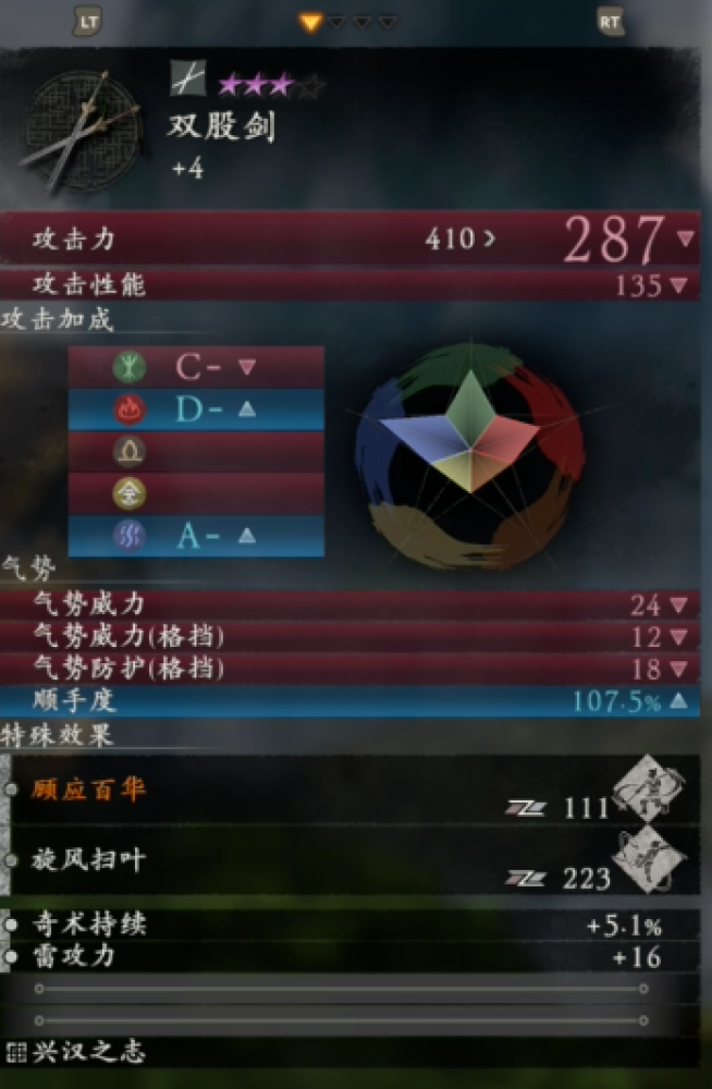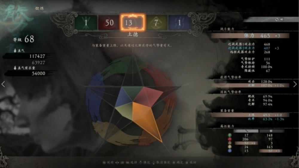 比如五行加點影響人物的對應屬性,加火行會提升角色攻擊力,降低使用絕技的士氣消耗,提升攻擊的士氣獲取,水行則是提升體力,降低化解的士氣消耗,土行能夠提升裝備的負重,提升成功化解時的士氣獲取...