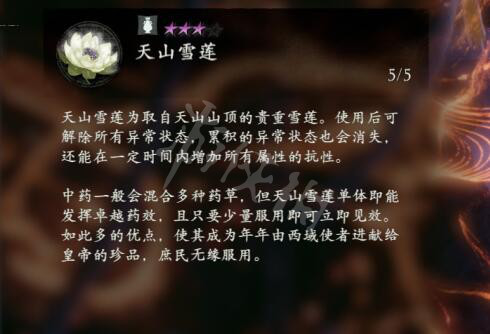 天山雪蓮為取自天山山頂的貴重雪蓮。使用後可解除所有異常狀態,累積的異常狀態也會消失,還能在一定時間內增加所有屬性的抗性。