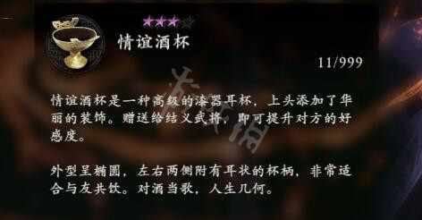 情誼酒杯是一種高級的漆器耳杯,上頭添加了華麗的裝飾。贈送給結義武將,即可提升對方的好感度。