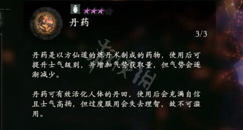 丹葯是以方仙道的煉丹術製成的葯物,使用後可提升士氣級別,並增加氣勢獲取量,但氣勢會逐漸減少。