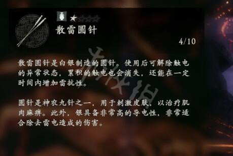 散雷圓針是白銀製造的圓針。使用後可解除觸電的異常狀態,累積的觸電也會消失,還能在一定時間內增加雷抗性。
