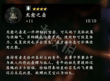 龍愈之壺是一件神秘的寶壺,可從地下龍脈收集與濃縮氣,並轉換成治癒靈葯。使用即可恢復體力,反覆使用也不會消失。在牙旗休息可補滿使用次數。