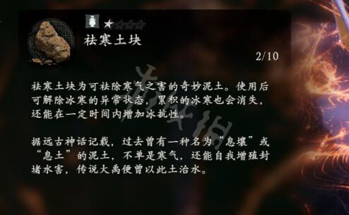 祛寒土塊為可祛除寒氣之害的奇妙泥土。使用後可解除冰寒的異常狀態,累積的冰寒也會消失,還能在一定時間內增加冰抗性。