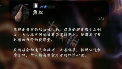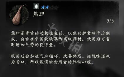 熊膽是貴重的動物性生葯,以熊的膽囊曬乾後製成,自古在中國就被尊為高級葯材。使用後可暫時增加氣勢的獲得量。