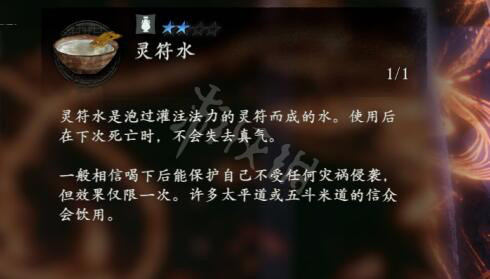 靈符水是泡過灌注法力的靈符而成的水。使用後在下次死亡時,不會失去真氣。