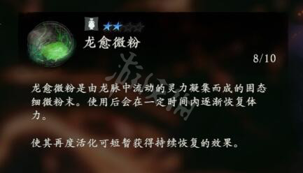 龍愈微粉是由龍脈中流動的靈力凝集而成的固態細微粉末。使用後會在一定時間內逐漸恢復體力。