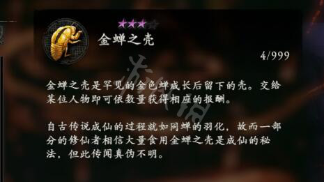金蟬之殼是罕見的金色蟬成長後留下的殼。交給某位人物即可依數量獲得相應的報酬。