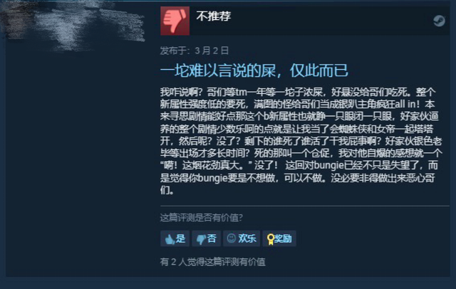 3月1日,玩家們期待已久的《命運2》DLC「光隕之秋」正式上線。也就在當天,《命運2》的steam在線人數超30萬,打破該系列的歷史最高紀錄。而今日(3月3日),僅在短短發售兩天後,「光隕之秋」資料片便差評如潮,目前Steam評價為多半差評(2600多個評測中好評率僅有29%)。