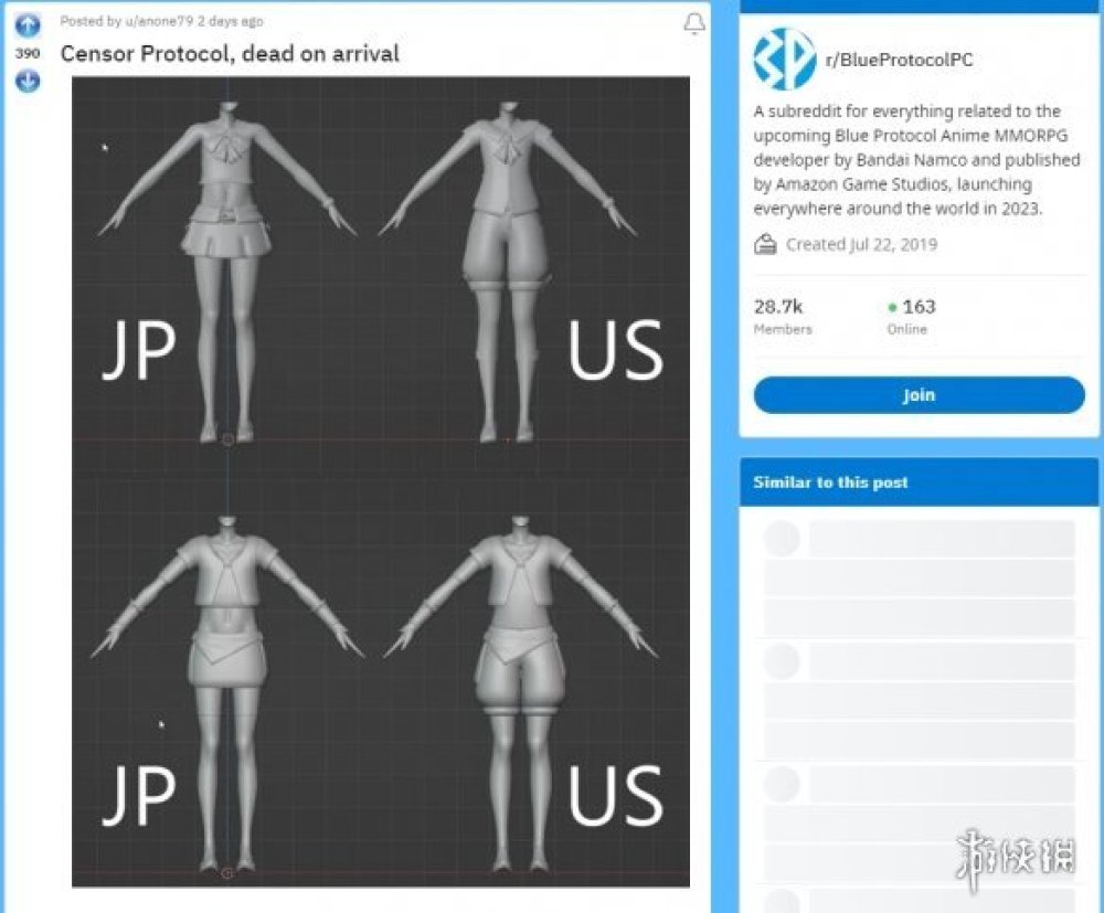 在《藍色協議》的reddit板塊上,用戶anone79發布了一張圖片,展示了拆包出的美服和日服遊戲中女性NPC模型間的差異。在左側,可以看到日服NPC模型是穿著短裙和短袖上衣。而右邊的美服NPC模型,穿著的是短褲和更寬大的上衣。