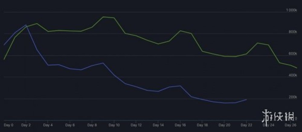 《霍格沃茨之遺》(藍)與《艾爾登法環》(綠)首發玩家熱度對比