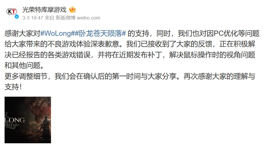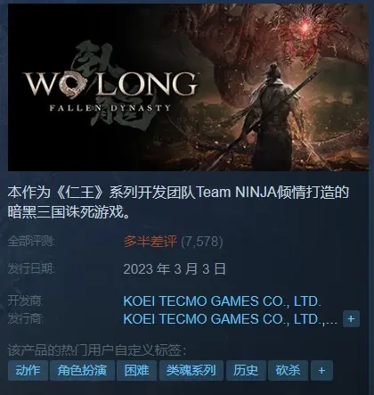 《卧龍:蒼天隕落》已於3月3日正式發售,但遊戲PC版本在發售後的一系列優化問題引發了玩家的不滿,許多玩家給出了差評的評價,目前遊戲在Steam平台的綜合評價為「多半差評」,7578篇評測中好評率為38%。