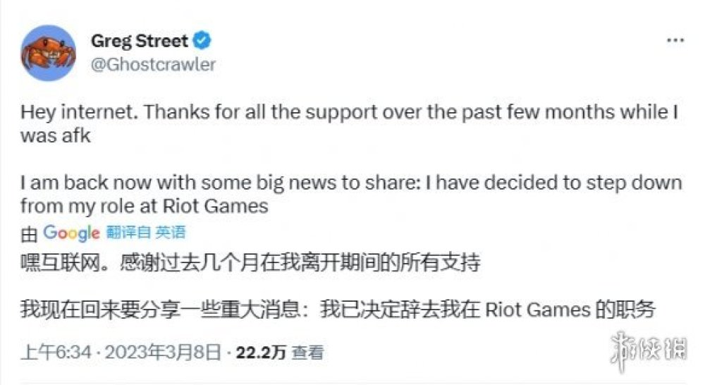 拳頭《英雄聯盟》大型MMO項目負責人Greg Street(國內人稱 鬼蟹)今日宣布,在拳頭公司工作9年後,因為個人原因,他已決定離職。