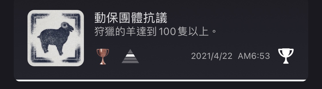 遊戲其中一個獎盃「動保團體抗議」要求玩家殺100只以上綿羊,注意是綿羊而不是山羊,綿羊可以在北方平原找到,數量非常多。在擊殺後對著羊按⭕剝取,高几率獲得【羊肉】,低機率獲得【羊毛】。