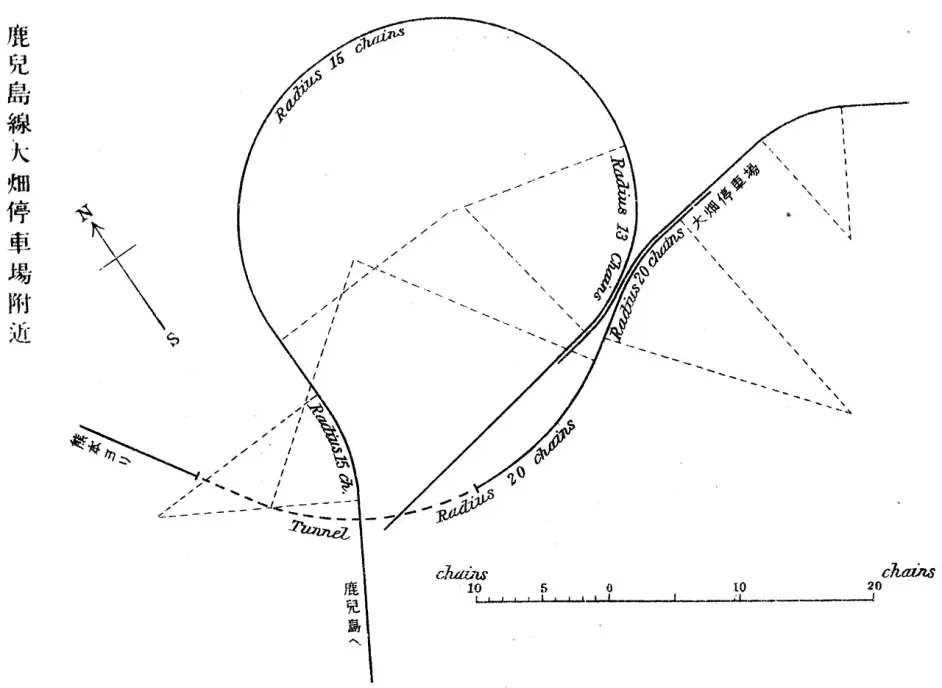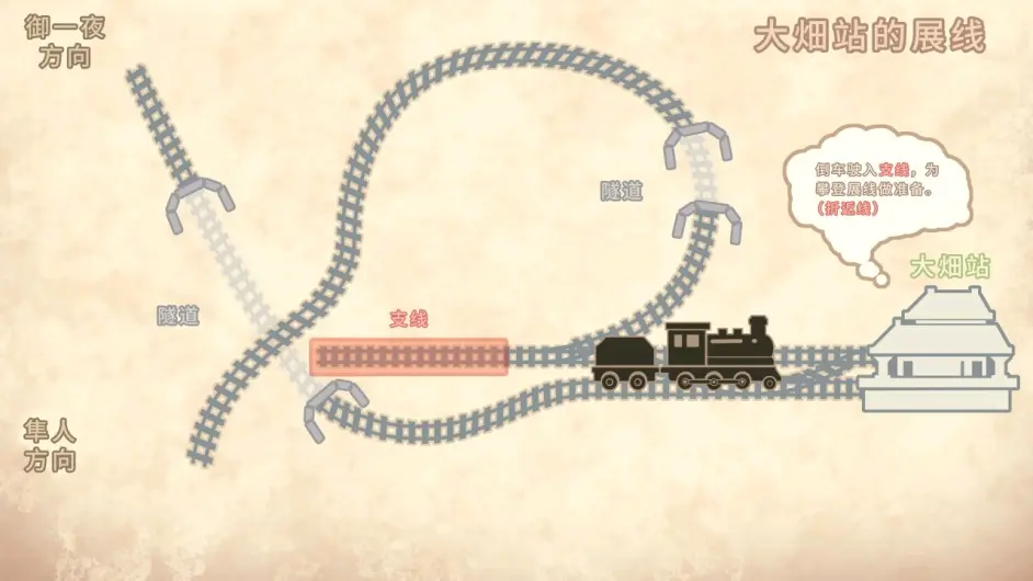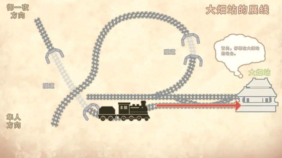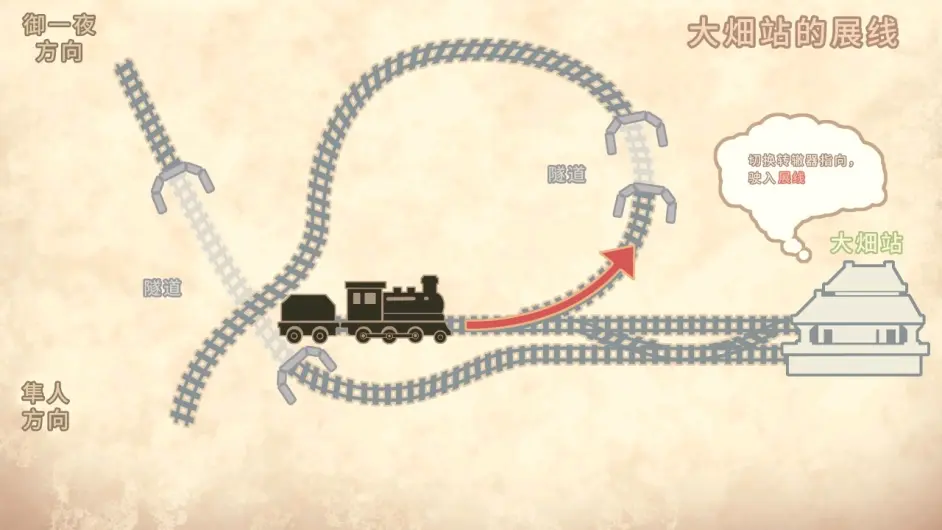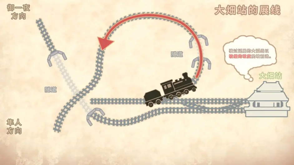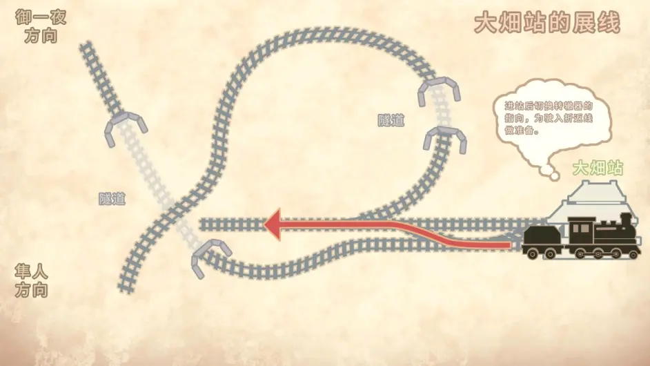 大畑站折返式與迂迴線簡圖值得一提的是,大畑站是無人車站,並且離最近的聚落也需要徒步一小時,大畑站僅作為整備與修整使用,月臺上唯一的洗手檯是供司機與乘客洗去臉上殘留的煤渣用的。